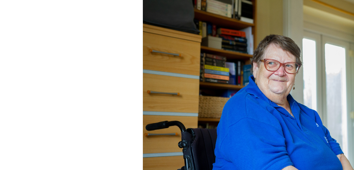 Older woman sat in a wheelchair smiling